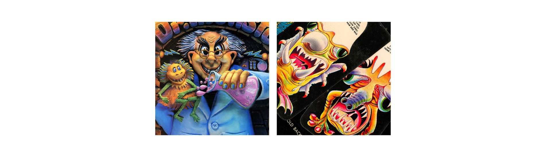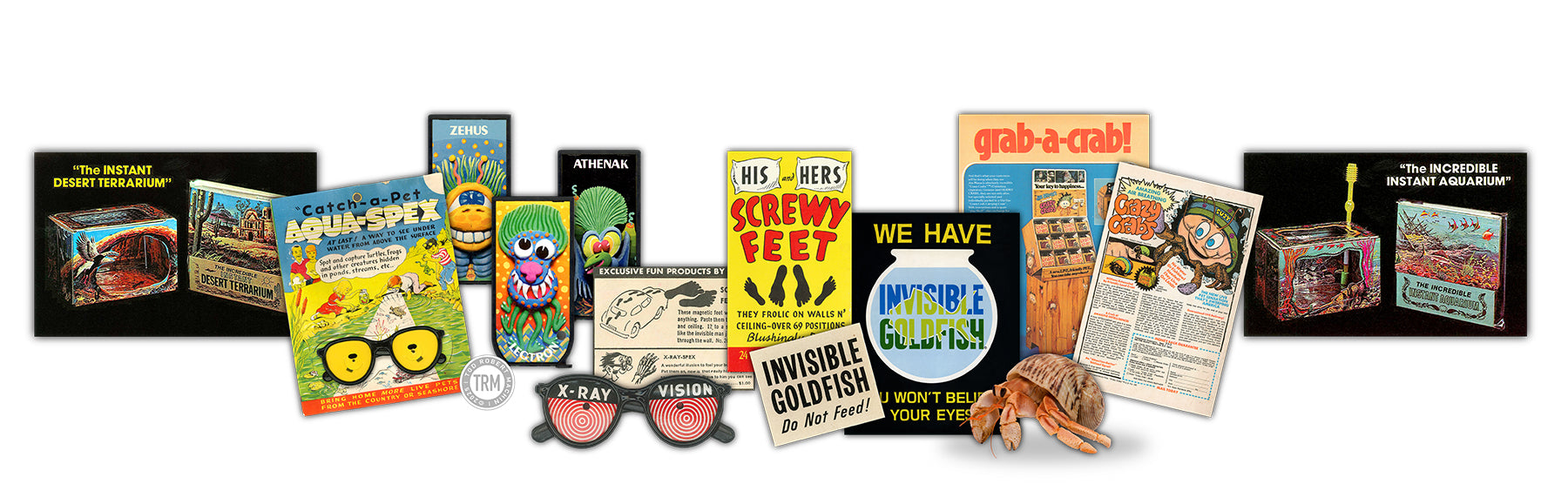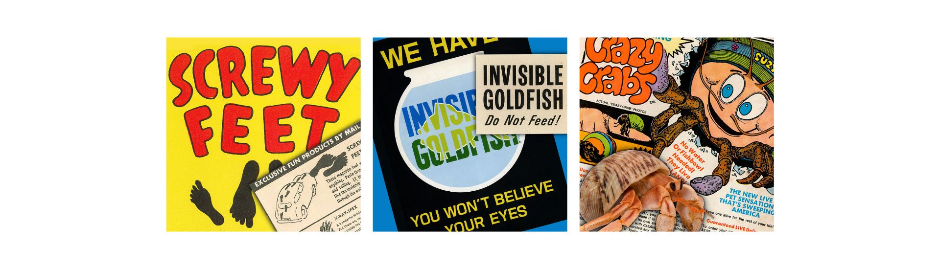 Among his many creations were AMAZING HAIR-RAISING MONSTERS®—cards featuring monsters that "grew vegitation hair" when water was added, SCREWY FEET®, self-clinging footprints that could walk up walls—and INVISIBLE GOLDFISH®, which came with a small glass bowl, invisible goldfish food, and a humorous guarantee that their owners would never see them.