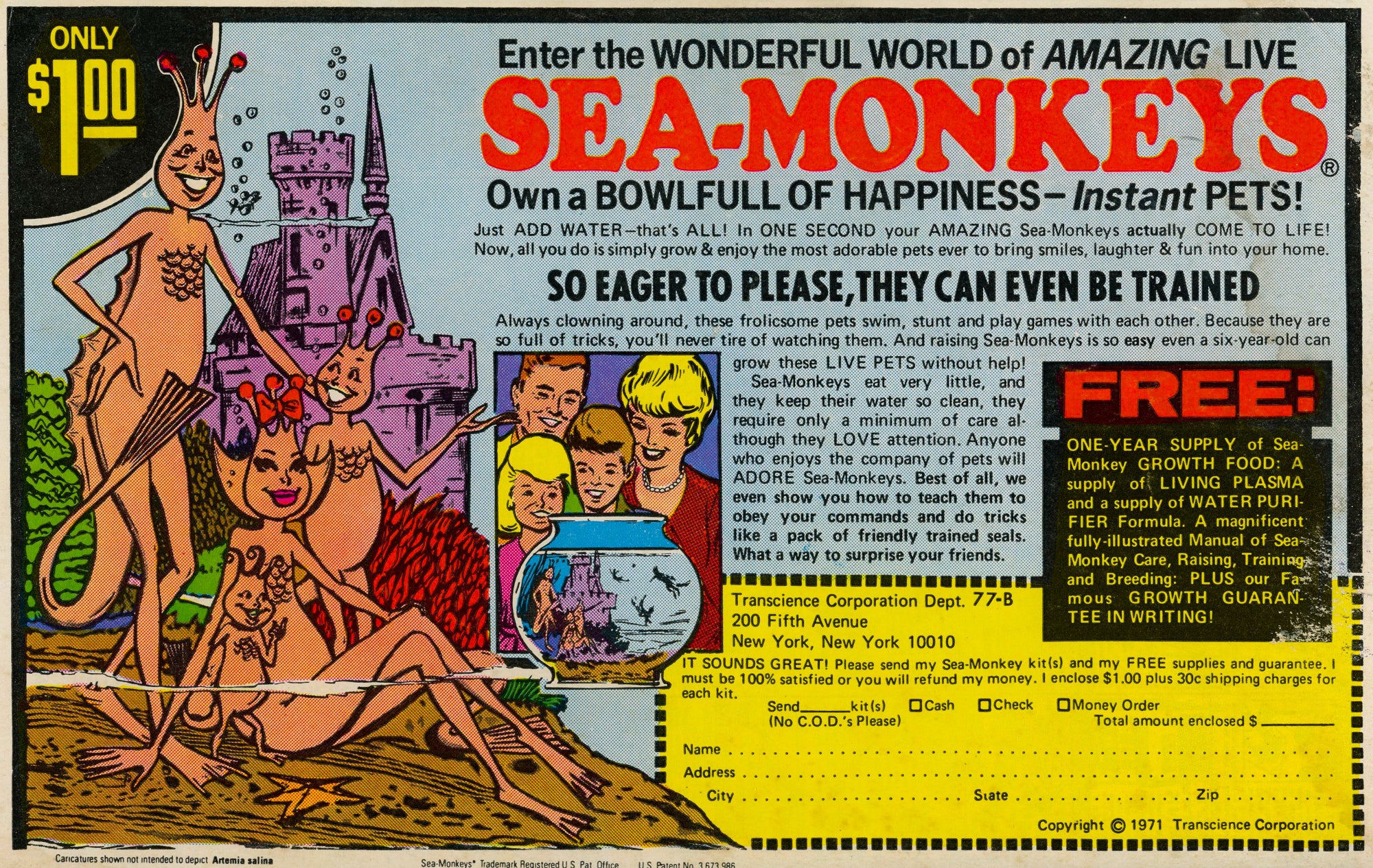 Initially, Sea-Monkeys® didn’t resonate with retailers due to Whamo-O’s unsuccessful “Instant Fish” product. So Harold had a brainwave: advertise them in comic books and sell directly to kids. It worked like a charm! Kids everywhere were soon ordering Sea-Monkeys® by mail, eagerly awaiting their "instant pets."